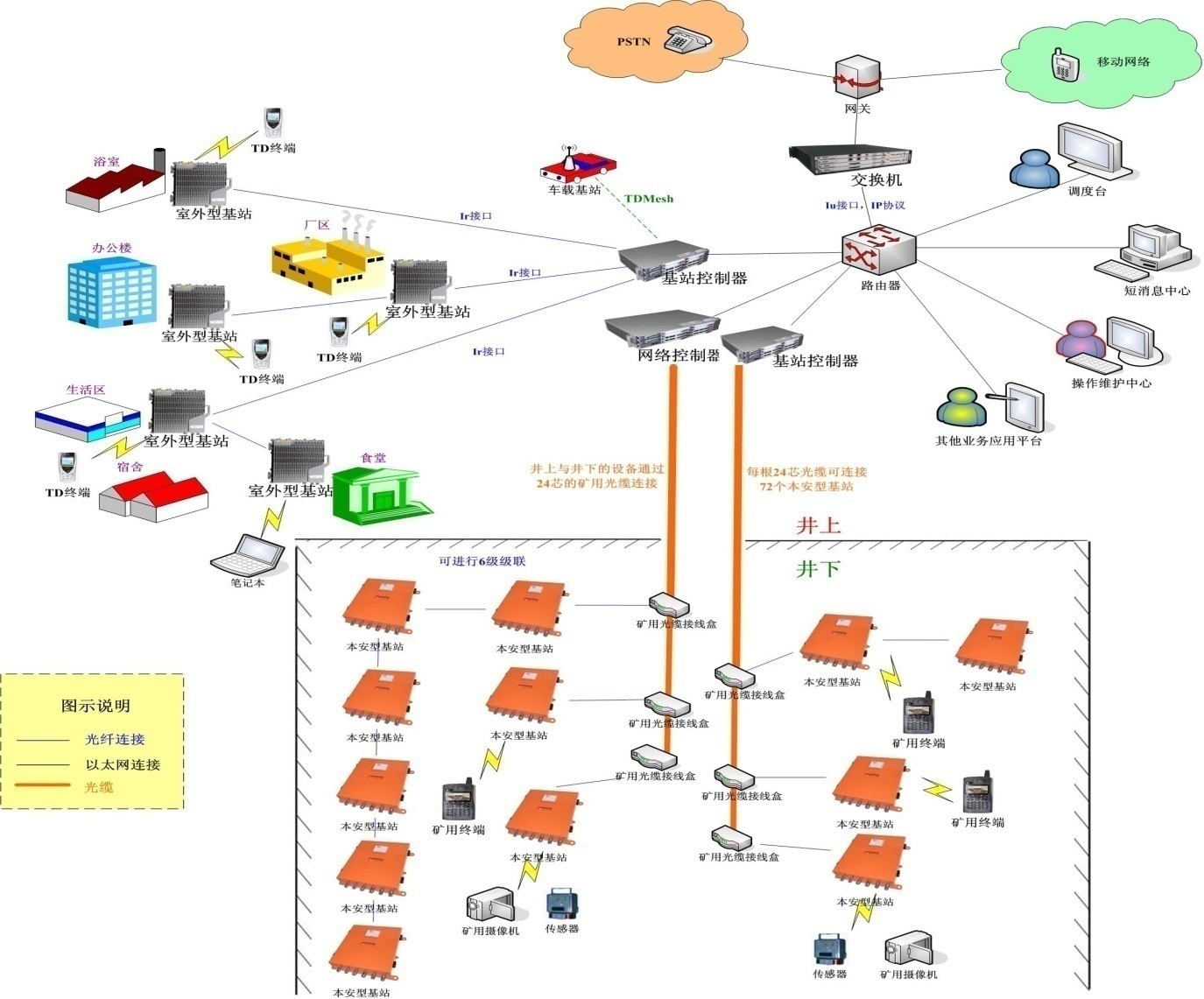 KT179矿用移动信息系统是采用我国自主知识产权、先进的TD-SCDMA技术,集无线调度、移动通信为一体的综合性矿用无线融合调度系统,可实现语音通讯调度、视频通话、无线视频监控、无线传感监测、无线上网服务、井下设备巡、点检、生产相关数据、人员等信息的实时查阅和调取等功能。系统主要由地面核心交换机、基站控制器、井下本安型基站、本安型手机等部分组成。系统可广泛应用于煤矿、隧道建设、石油、化工等行业的移动通信、数据、多媒体、移动信息查询等业务。